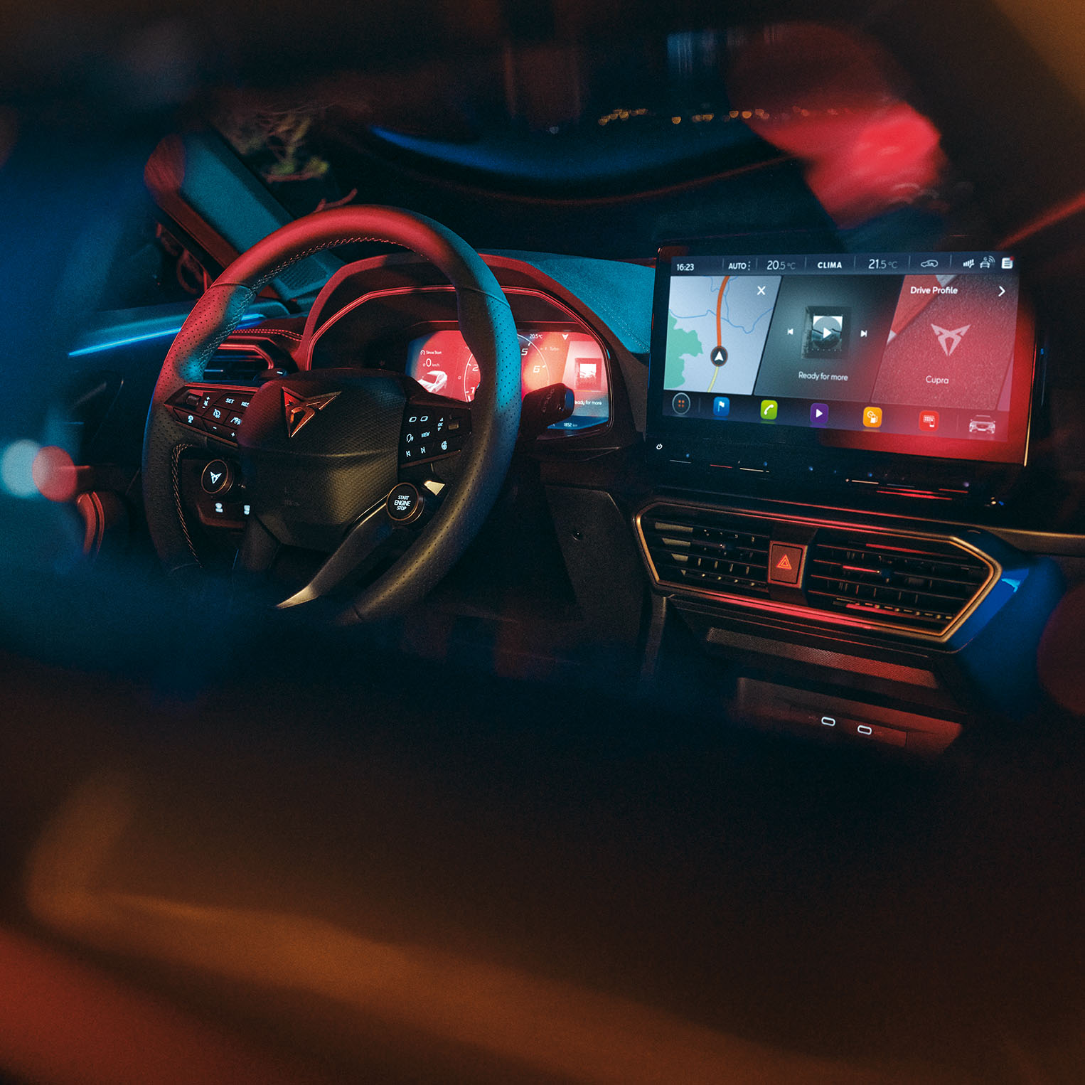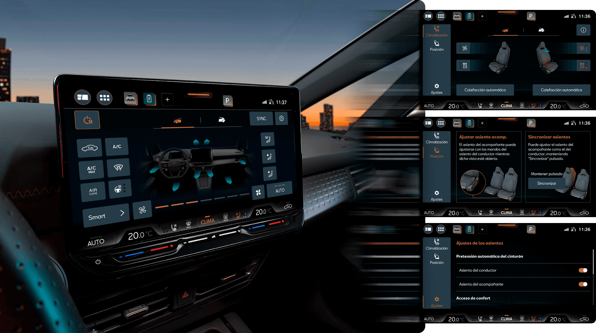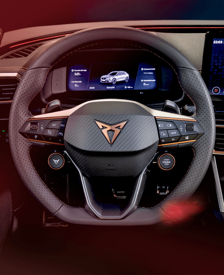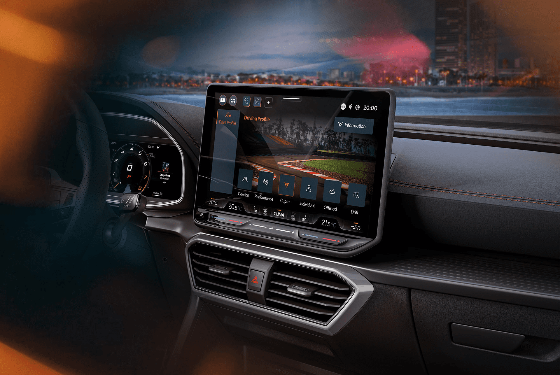 Diseño e implementación de interfaces gráficas para los vehículos de CUPRA, abarcando tanto la pantalla central como el cuadro de instrumentos digital del conductor.